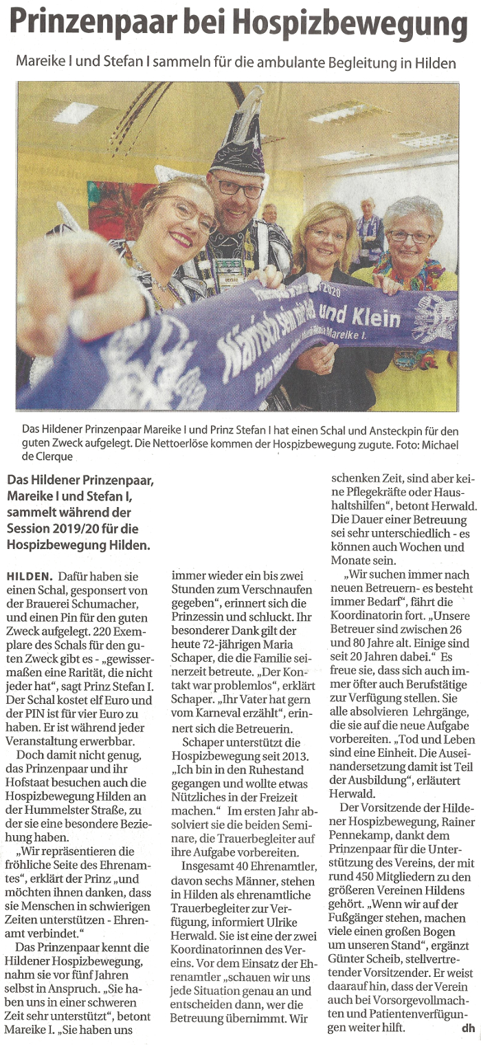 Prinzessin Hildania Mareike I. und Prinz Hildanus Stefan I. nutzen ihre Bekanntheit und die damit verbundene Reichweite, um auf Alltagshelden aufmerksam zu machen, die sie persönlich stark geprägt haben. Mit dem Verkauf ihres Prinzenschals sammeln sie Geld, das der Hospizbewegung Hilden zugute kommt.